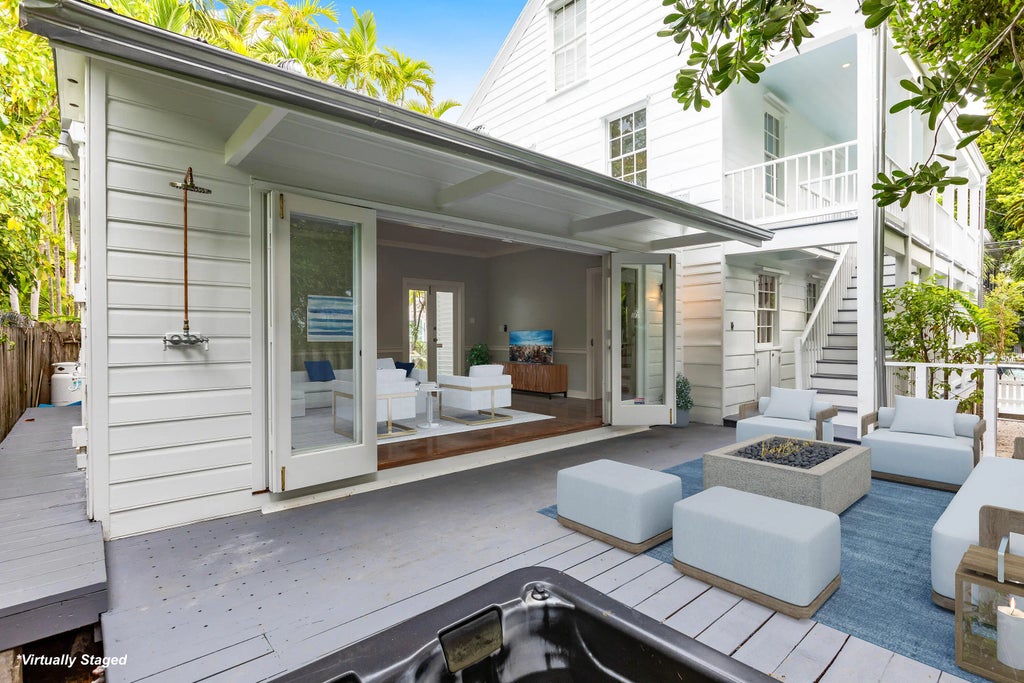 Blending timeless character and modern comfort this home is nestled on one of Old Town's most coveted streets. Come discover this captivating home steeped in rich history. The kitchen has been thoughtfully redesigned with granite counters, new stainless-steel appliances & now has an open layout that enhances both function and flow. The Richard Roberts home, originally transported from Green Turtle Cay, Bahamas in 1847, stands as a cherished Key West icon. With 4 or 5 bedrooms, 3 baths, plus an office space (or 5th bedroom), its versatile floor plan offers endless possibilities. Enjoy the outdoors with four inviting porches (two on each side), warm wood pine walls, and heart pine floors throughout, this residence has earned 2 stars through the years from the Historical Florida Keys foundation. A wonderful great room or downstairs primary suite effortlessly spills onto a side yard deck & jacuzzi. Access to the second floor is via an outdoor staircase and the third floor hosts a generous bedroom and bath suite or could also serve as two bedrooms. This historically significant home is a true Key West landmark. Just 3 blocks from Duval St. & the waterfront, its quiet neighborhood is walkable to all the shops, galleries & fine restaurants.