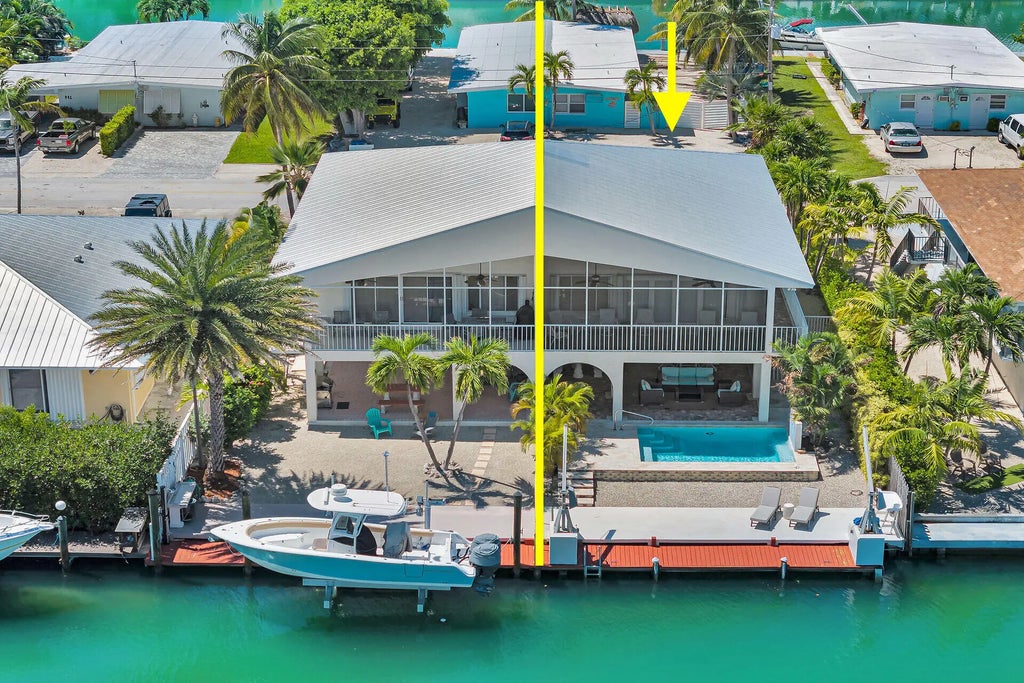 This well-maintained 2 Bedroom, 2 Bath elevated canal front half duplex with private Pool offers the perfect mix resort-style amenities and laid-back coastal living. Located on a wide canal with your own private dockage, it's an excellent spot for boating, fishing, or simply enjoying the water just steps from your door. This solid concrete stilted home features two bedrooms and two full bathrooms, including a spacious master suite with a large walk-in closet. The open living area is bright and inviting, with plenty of natural light and space to relax or entertain. Upstairs, a screened balcony overlooks the pool and canal, creating a peaceful place to enjoy the breeze and water views. Downstairs, there is a large covered area under the home that offers plenty of room to hang out, entertain guests, or store your gear. Take a dip in your private custom pool and soak up the tropical lifestyle. Whether you're hosting family and friends or looking for a quiet retreat, this home offers versatile indoor and outdoor spaces to suit your needs. With excellent storage on the lower level and room for all your water toys, this home is ideal as a vacation getaway, full-time residence, or investment property with good weekly rental history. Come enjoy all that Key Colony Beach has to offer including beautiful beaches, golf, tennis, pickleball, members only beach club, Sunset Park plus shopping and dining just a short walk away.